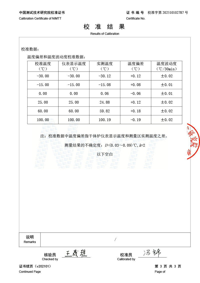| 上一條:超低溫面源黑體爐(-40-80℃)校準(zhǔn)證書(shū) | 下一條:高精度制冷恒溫槽(-80~100℃)校準(zhǔn)證書(shū) |