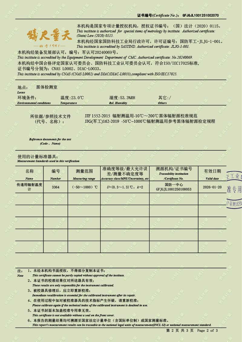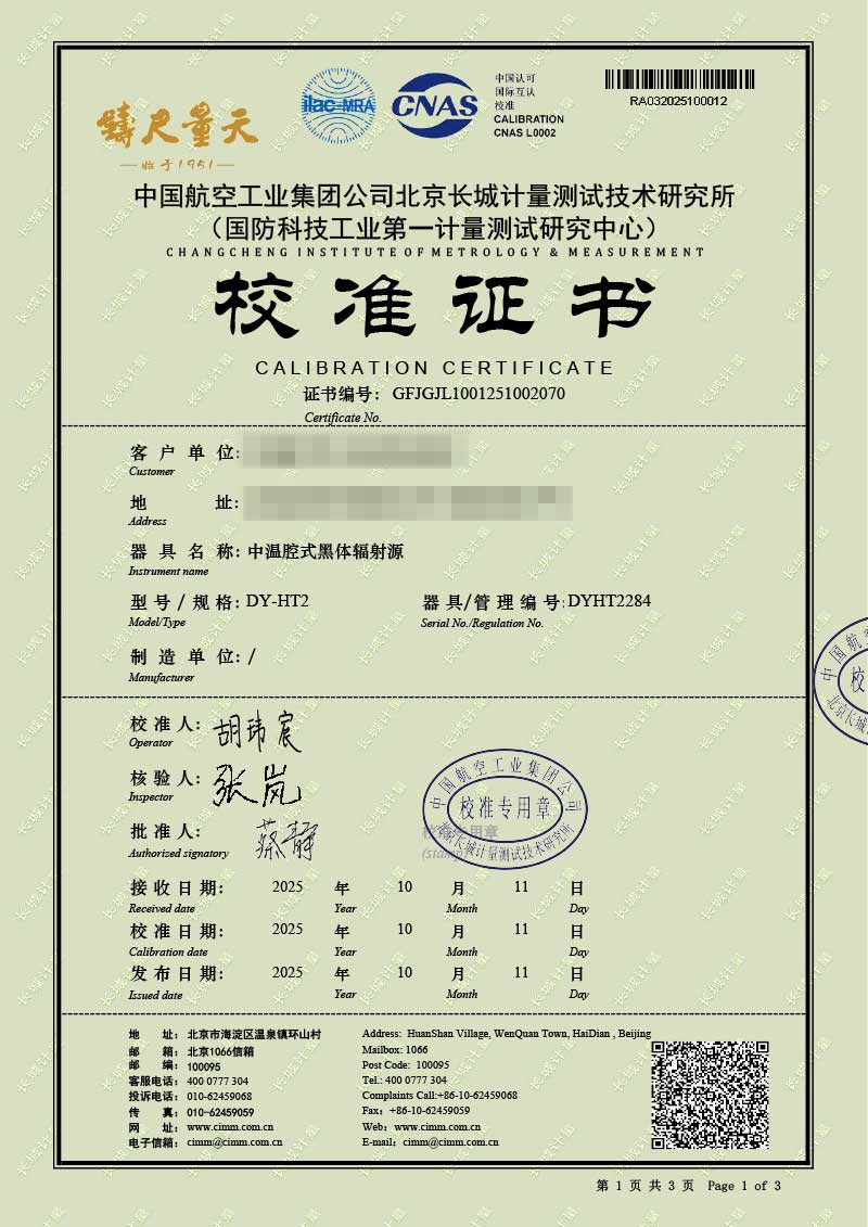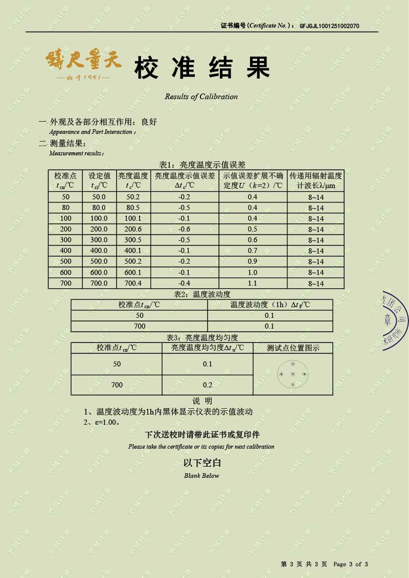 | 上一條:高溫腔式黑體輻射源(700-1600℃)校準(zhǔn)證書 | 下一條:溫濕度檢定箱校準(zhǔn)證書 |