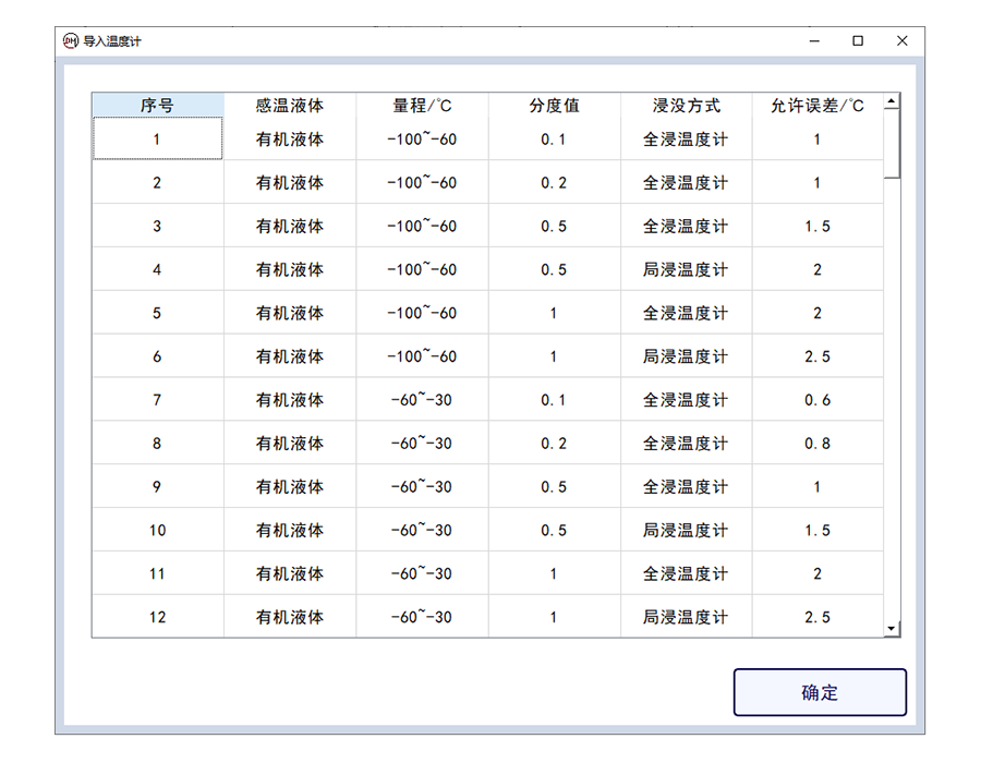 4.可進(jìn)行玻璃溫度計的類型選擇,選擇分度值、浸沒類型計允差,判斷溫度是否合格,
