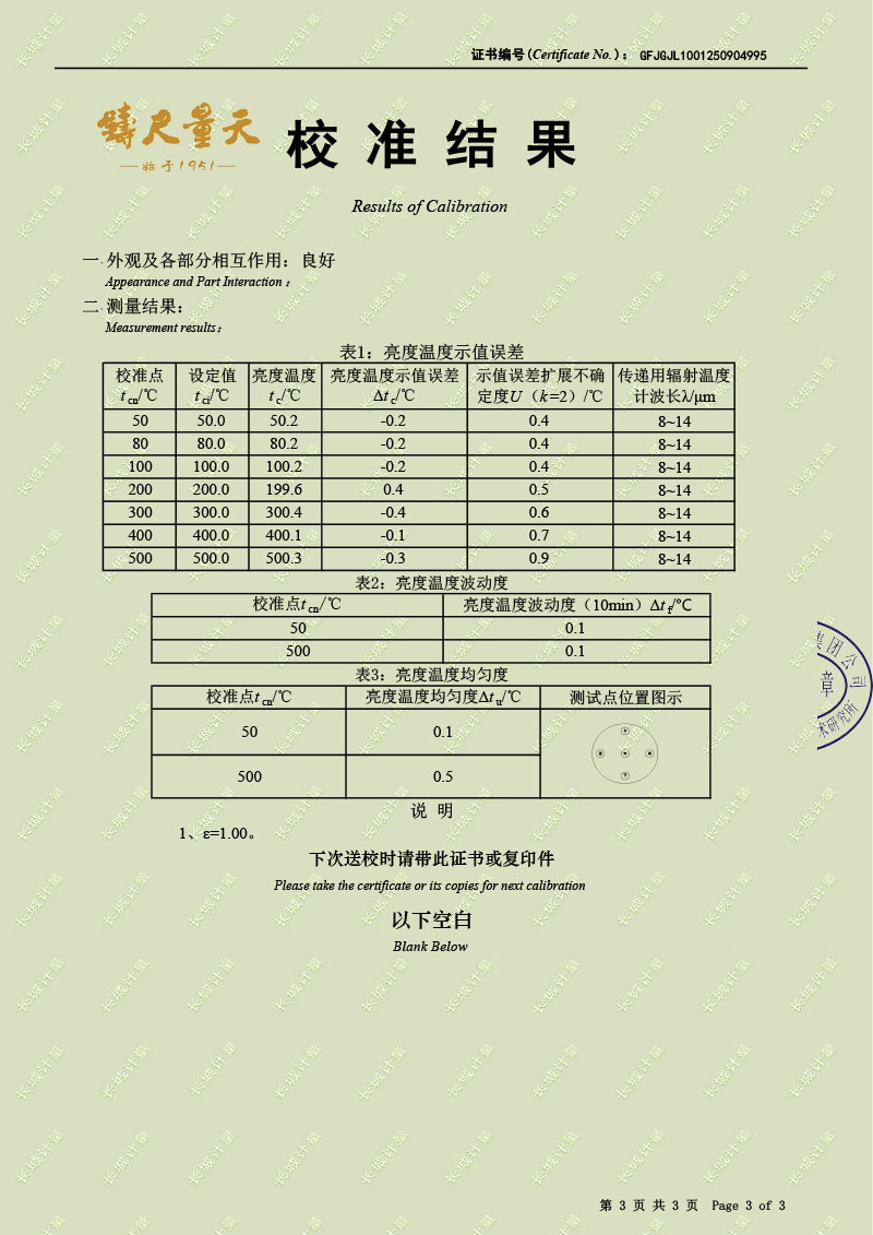 | 上一條:黑體輻射源(-15-80℃)校準(zhǔn)證書(shū) | 下一條:高精度制冷恒溫槽(-80~100℃)校準(zhǔn)證書(shū) |