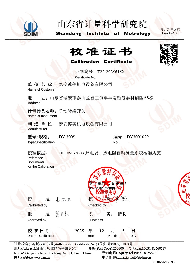 德美手動轉(zhuǎn)換開關(guān)校準證書