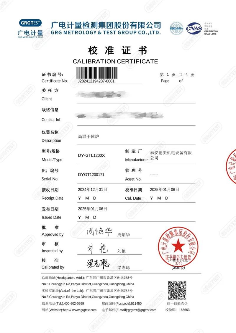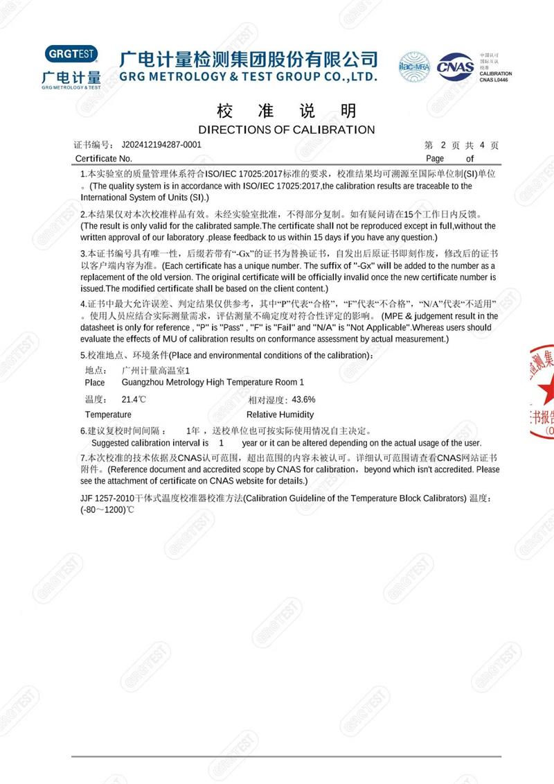 高溫干體爐(300-1200℃)校準證書 2025-1-13 本文被閱讀 6478 次