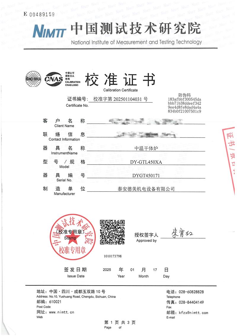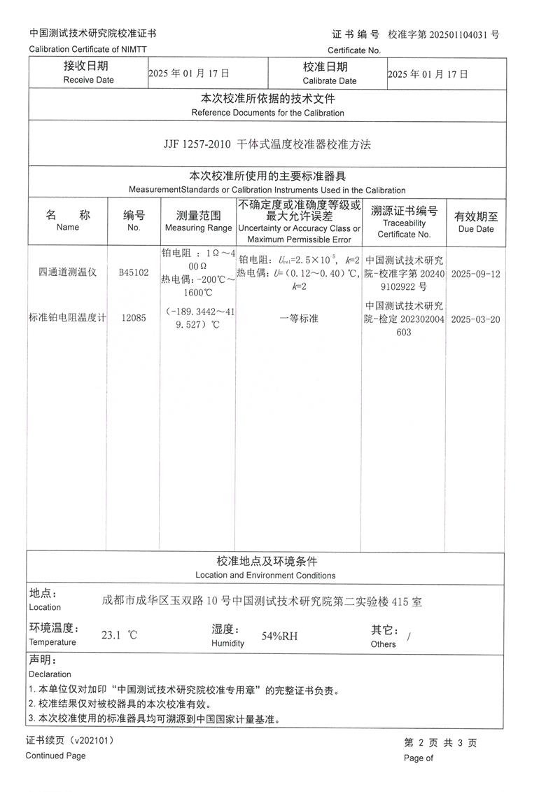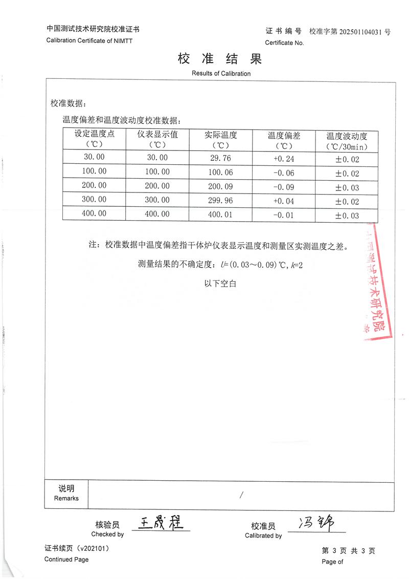| 上一條:高溫干體爐(300-1200℃)校準(zhǔn)證書 | 下一條:高精度制冷恒溫槽(-80~100℃)校準(zhǔn)證書 |