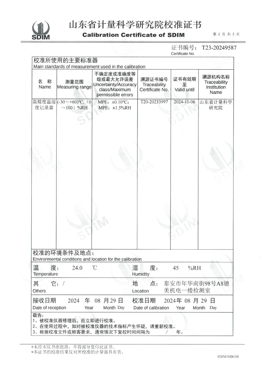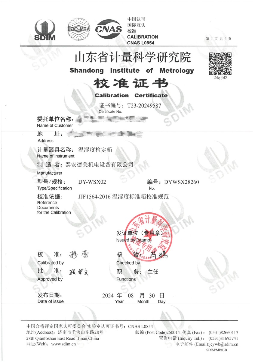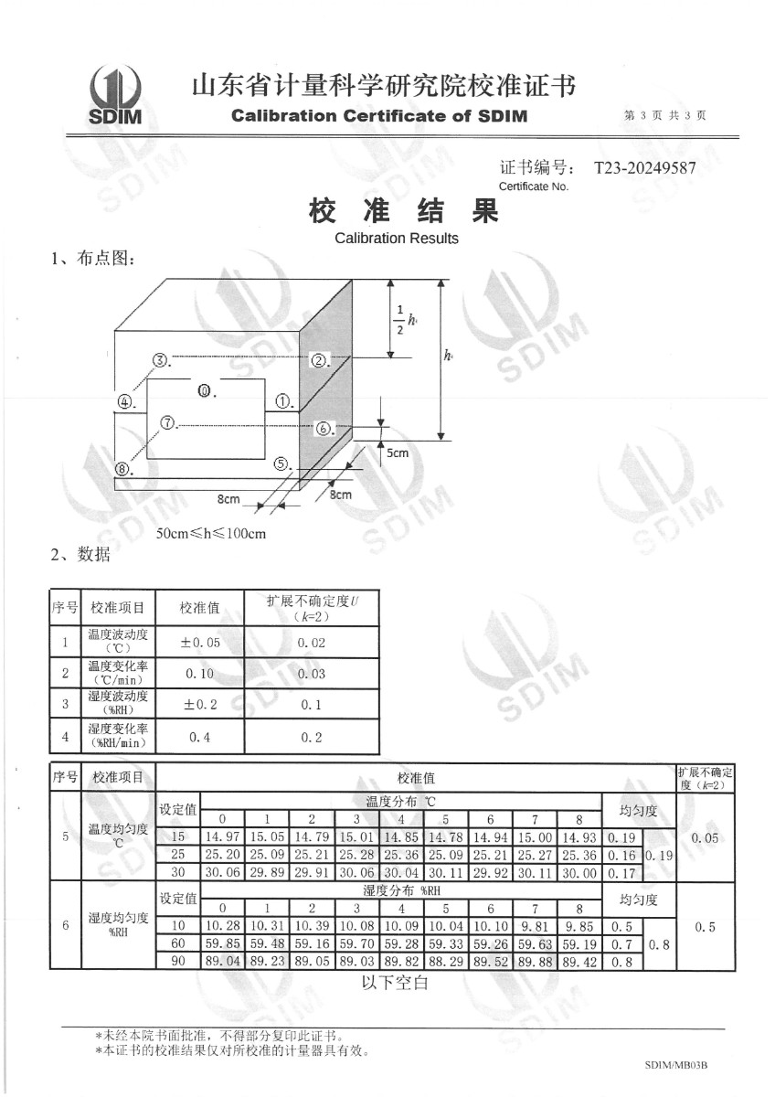 溫濕度檢定箱(-20~80℃)校準證書 2024-9-3 本文被閱讀 6094 次