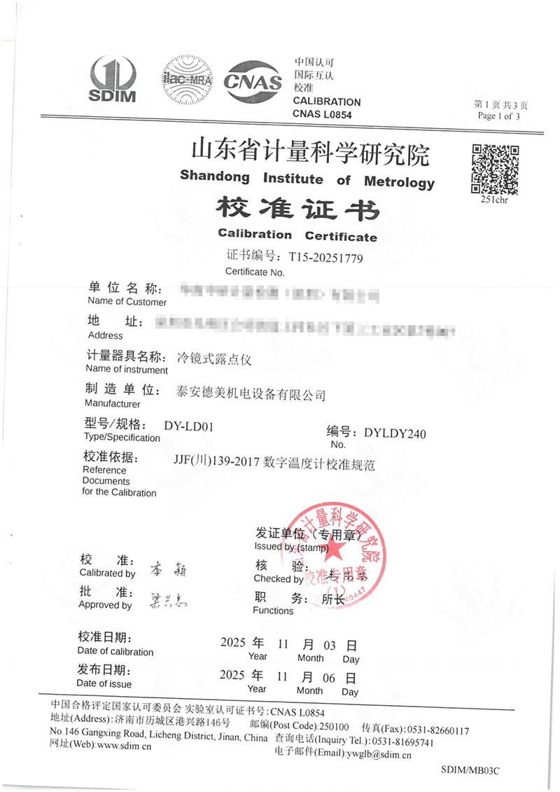 冷鏡式露點(diǎn)儀校準(zhǔn)證書 2025-11-7 本文被閱讀 1098 次