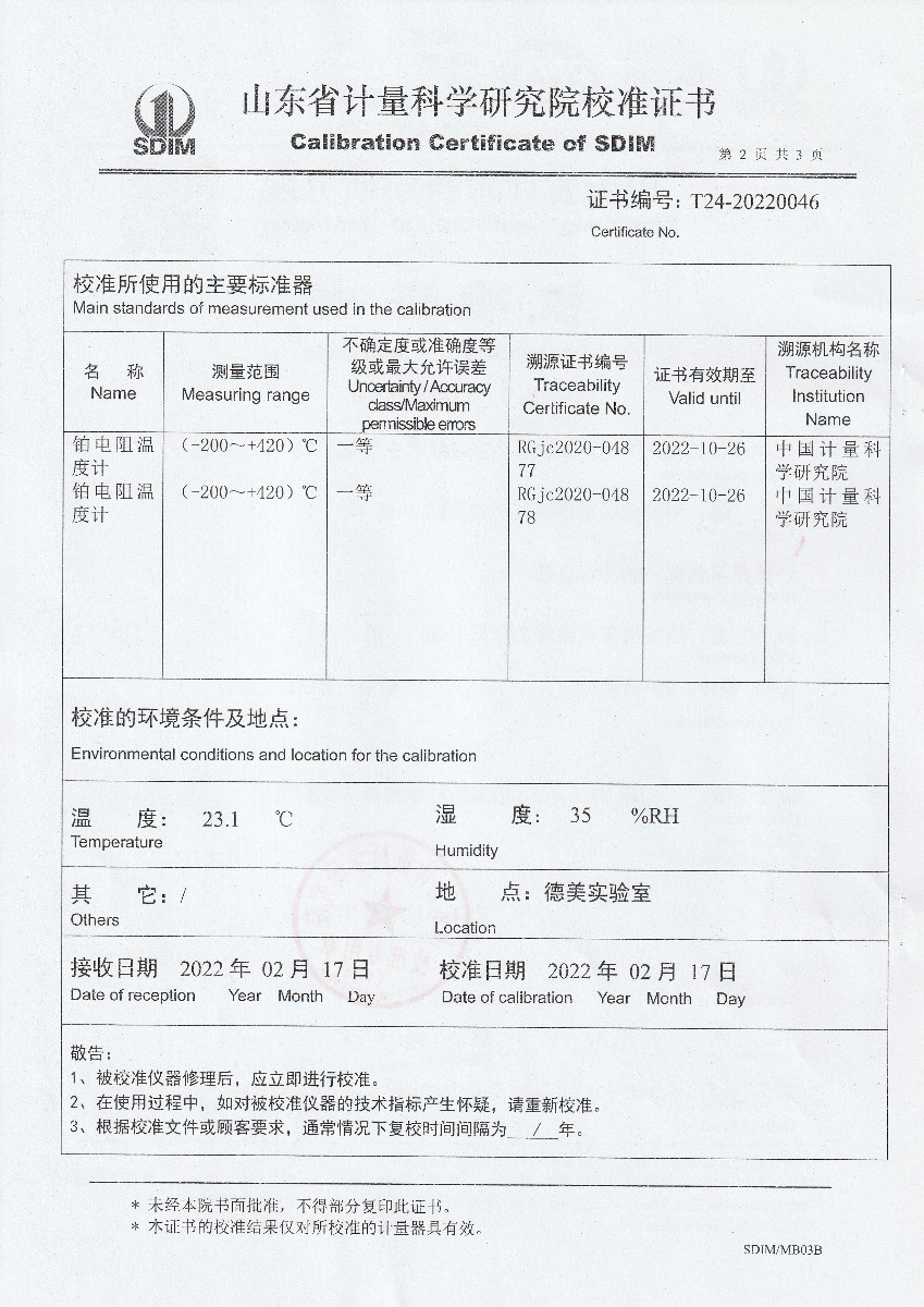 | 上一條:河北京車軌道交通車輛裝備有限公司-熱電偶檢定爐 | 下一條:高精度制冷恒溫槽(-80~100℃)校準(zhǔn)證書 |