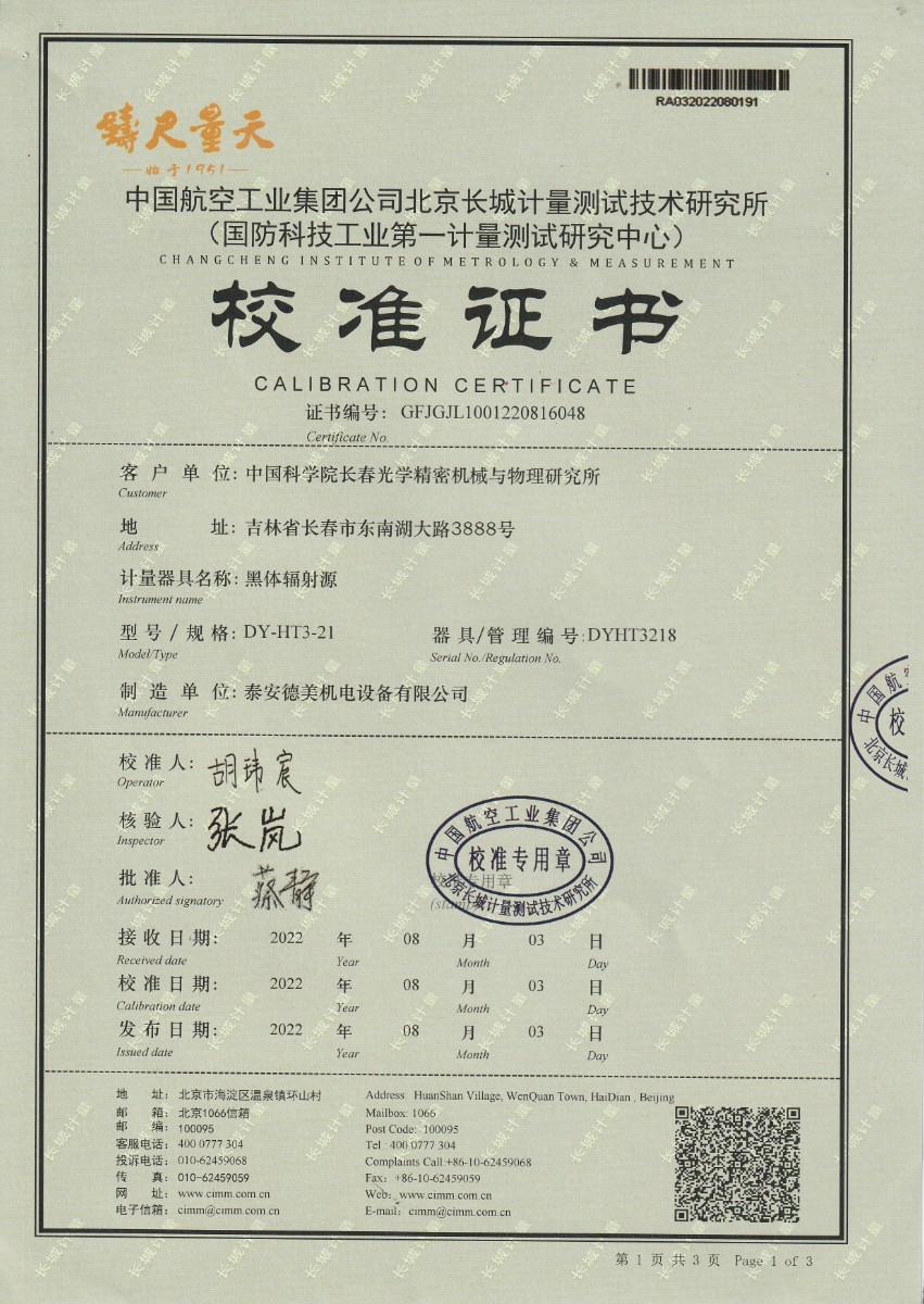 | 上一條:中國(guó)科學(xué)院長(zhǎng)春光學(xué)精密機(jī)械與物理研究所-黑體爐DY-HT3-11 | 下一條:溫濕度檢定箱校準(zhǔn)證書(shū) |