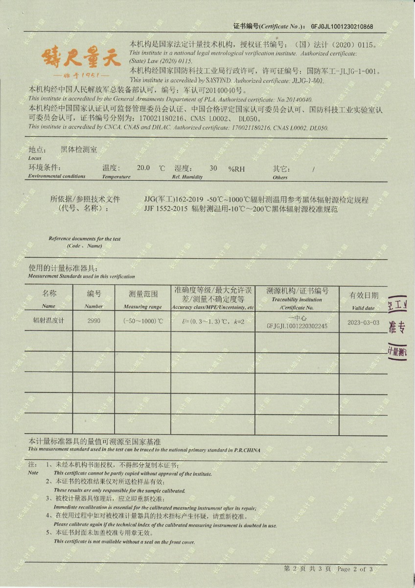 | 上一條:西安和其光電科技股份有限公司 低溫浴式黑體輻射源 校準證書 | 下一條:高精度制冷恒溫槽(-80~100℃)校準證書 |