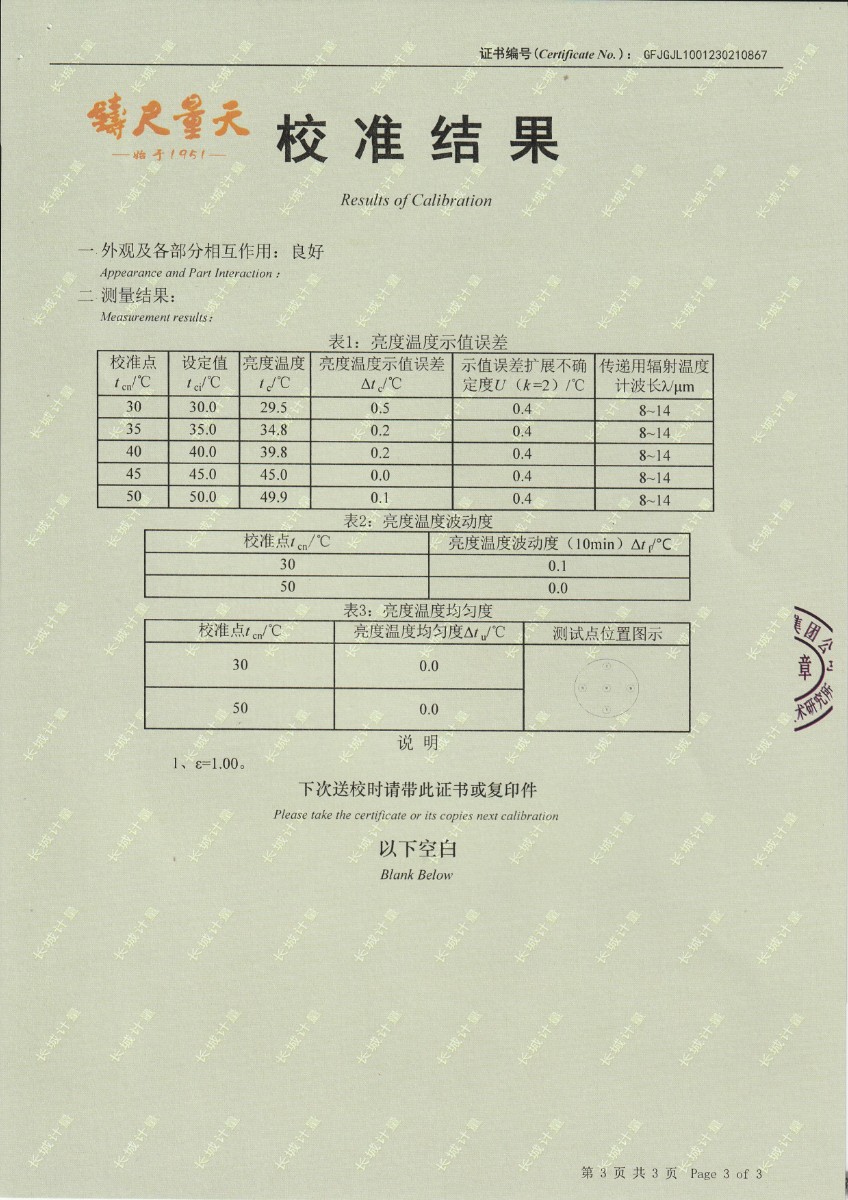 | 上一條:江蘇省產(chǎn)品質(zhì)量監(jiān)督檢驗(yàn)研究院 黑體輻射源 校準(zhǔn)證書 | 下一條:高精度制冷恒溫槽(-80~100℃)校準(zhǔn)證書 |
