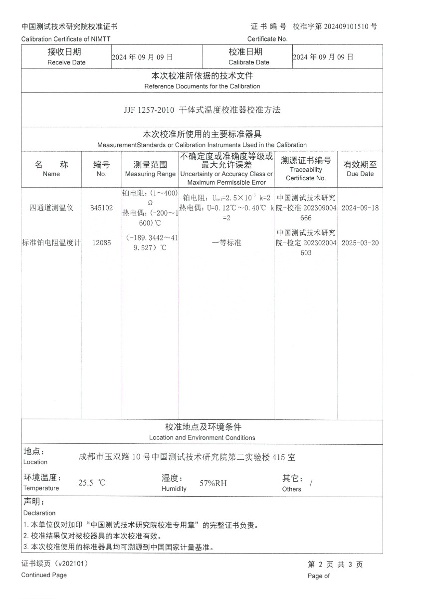 | 上一條:高溫干體爐(300~1200℃)校準(zhǔn)證書 | 下一條:高精度制冷恒溫槽(-80~100℃)校準(zhǔn)證書 |
