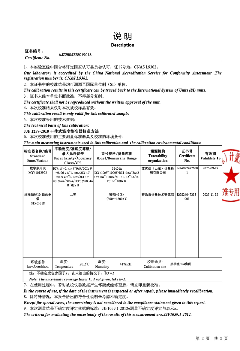 | 上一條:高精度數(shù)字溫度計(-50-450℃)校準(zhǔn)證書 | 下一條:高精度制冷恒溫槽(-80~100℃)校準(zhǔn)證書 |