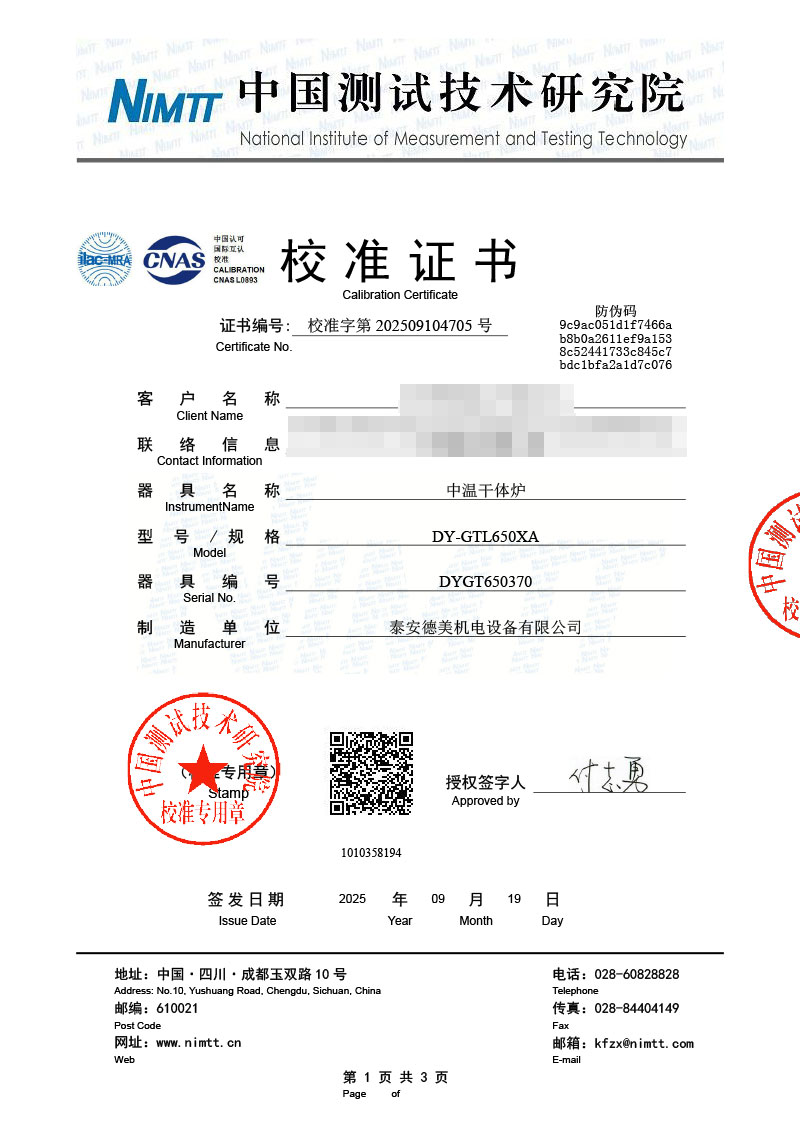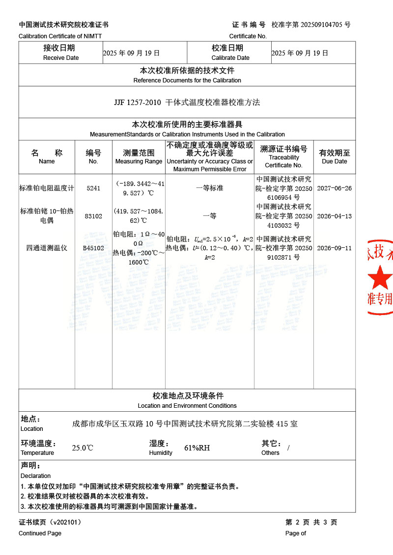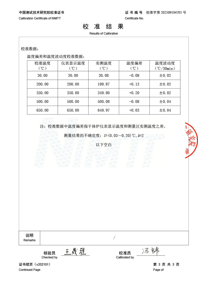 | 上一條:高溫干體爐(300-1200℃)校準(zhǔn)證書 | 下一條:高精度制冷恒溫槽(-80~100℃)校準(zhǔn)證書 |