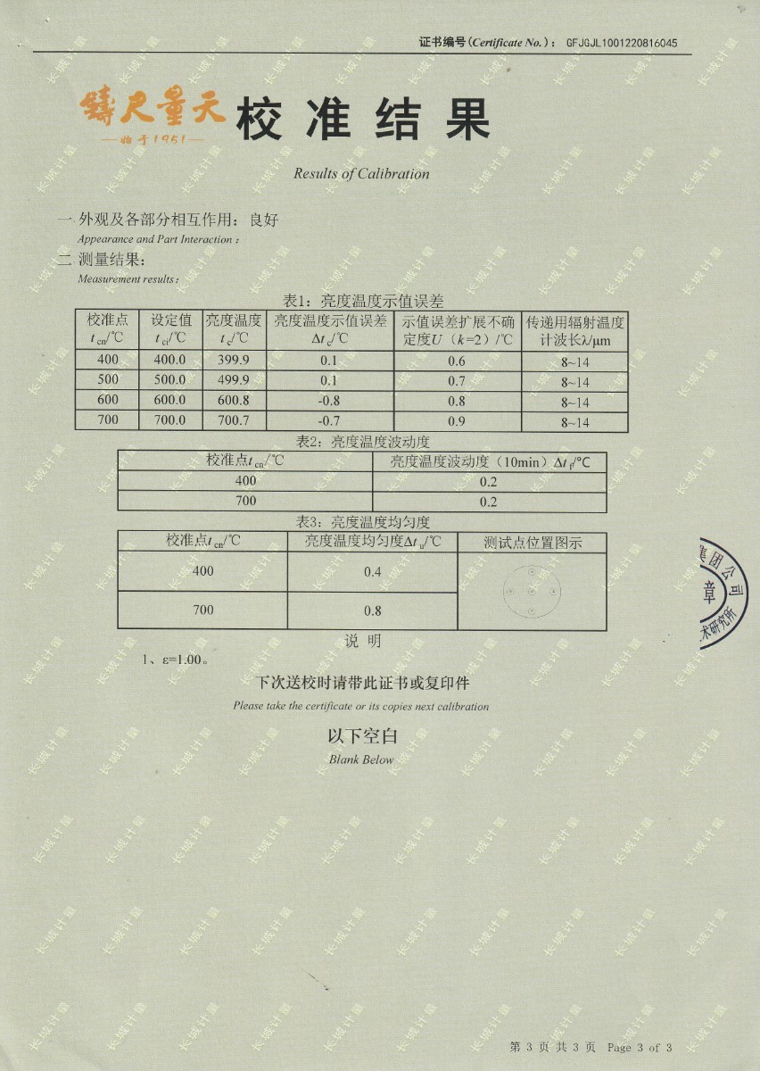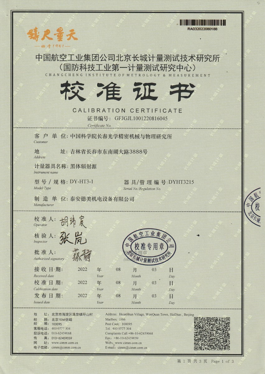 | 上一條:中國科學院長春光學精密機械與物理研究所-黑體爐DY-HT2-11 | 下一條:高精度制冷恒溫槽(-80~100℃)校準證書 |