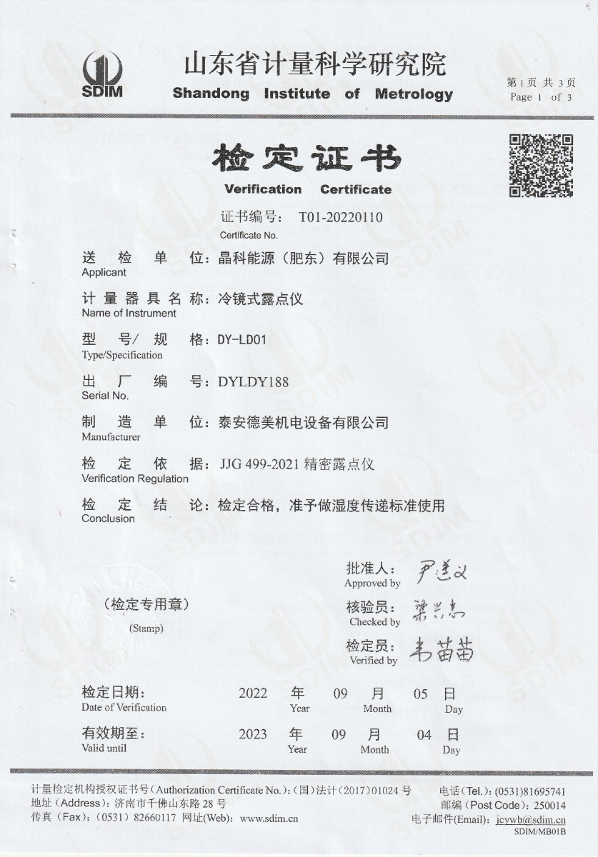 | 上一條:晶科能源(肥東)有限公司-溫濕度檢定箱 | 下一條:高精度制冷恒溫槽(-80~100℃)校準(zhǔn)證書(shū) |