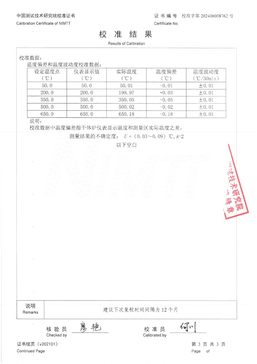 | 上一條:中溫干體爐295(50~650℃)校準(zhǔn)證書(shū) | 下一條:高精度制冷恒溫槽(-80~100℃)校準(zhǔn)證書(shū) |