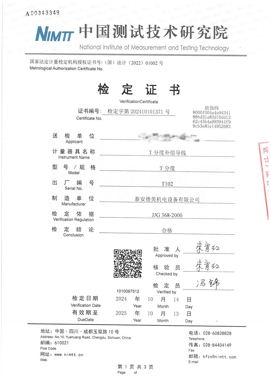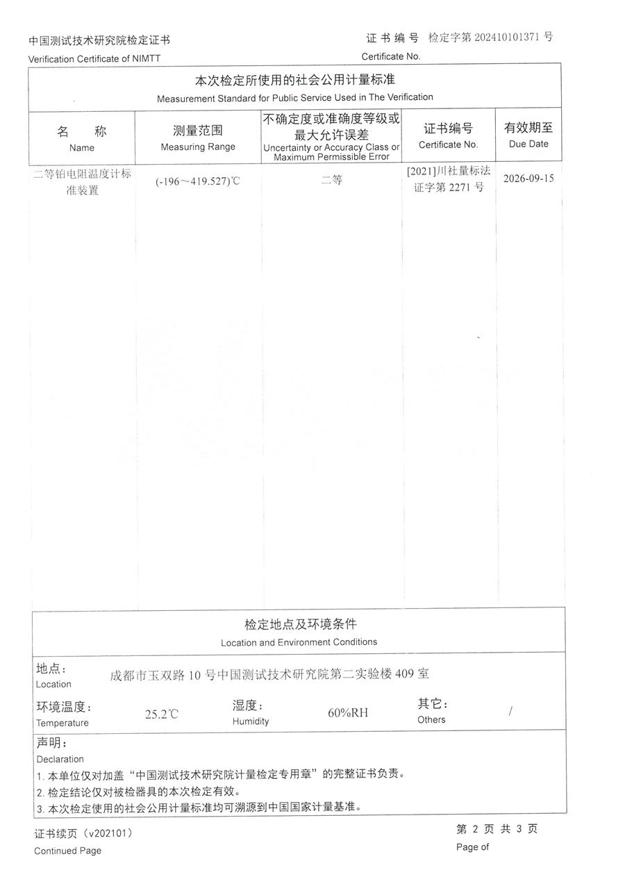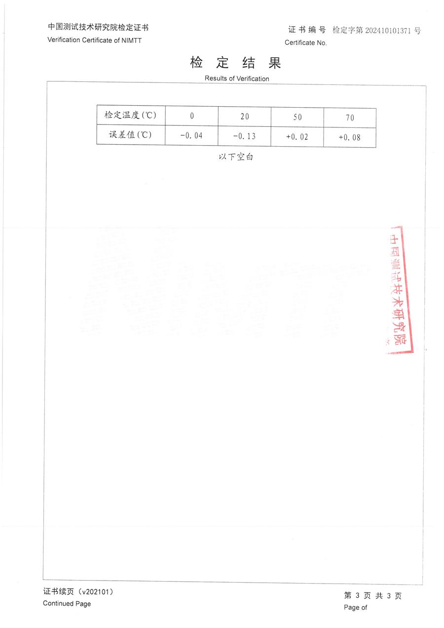 | 上一條:面源黑體爐(室溫+5-300℃)校準(zhǔn)證書 | 下一條:高精度制冷恒溫槽(-80~100℃)校準(zhǔn)證書 |