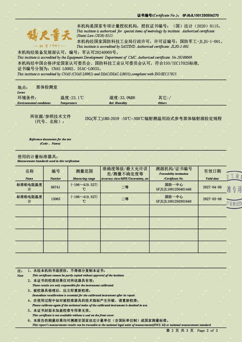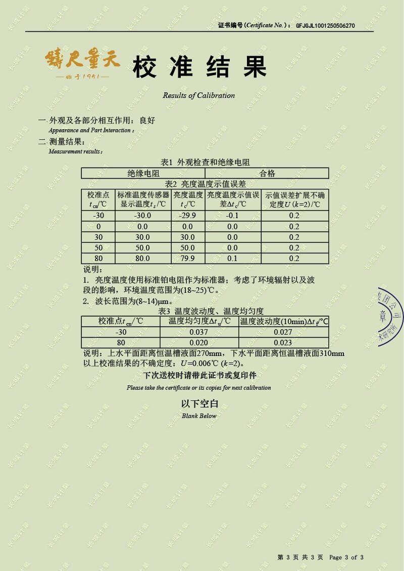 | 上一條:面源黑體輻射源(50-500℃)校準(zhǔn)證書 | 下一條:高精度制冷恒溫槽(-80~100℃)校準(zhǔn)證書 |
