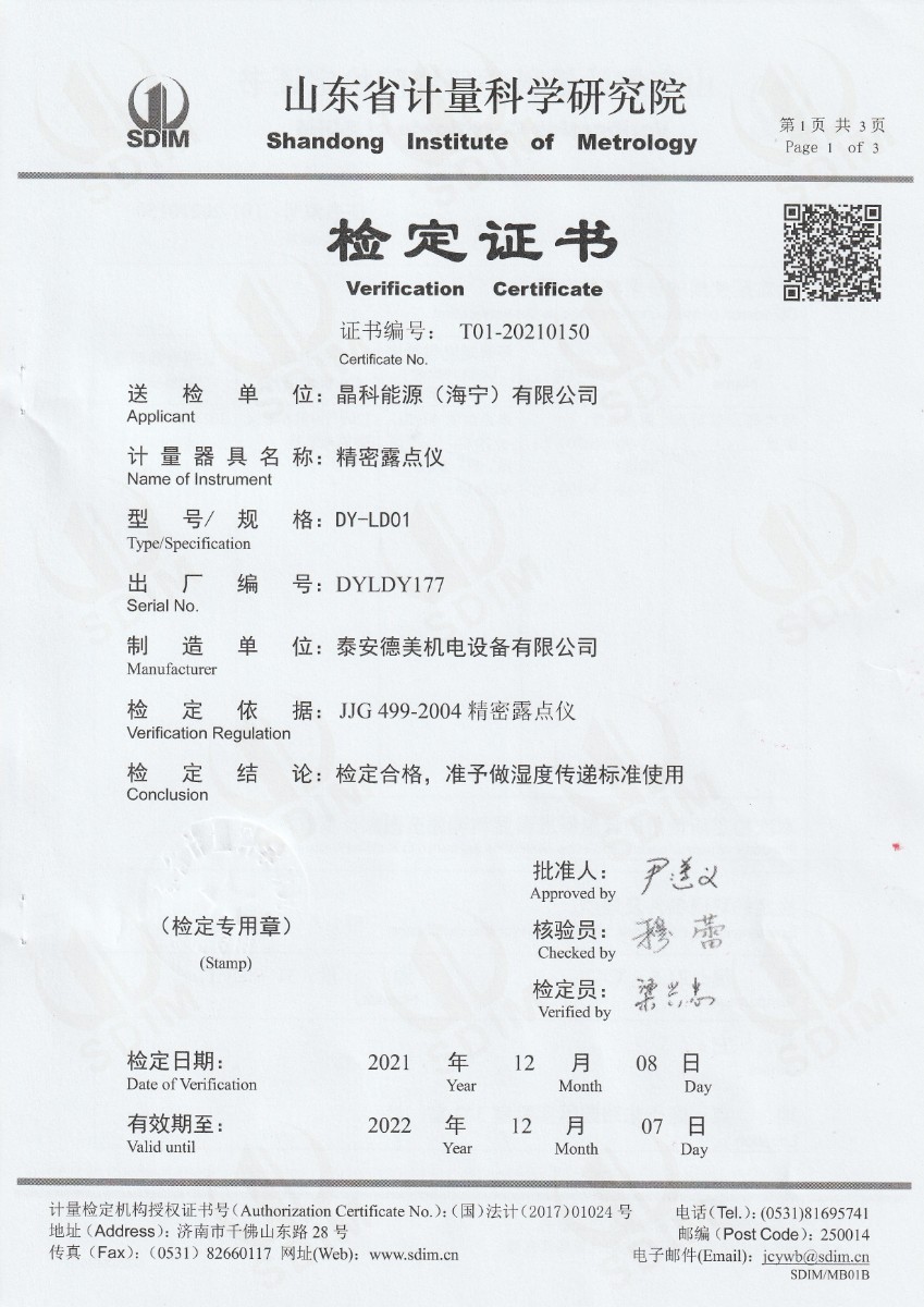 | 上一條:安徽晶科能源有限公司-精密露點儀(溫度) | 下一條:高精度制冷恒溫槽(-80~100℃)校準(zhǔn)證書 |