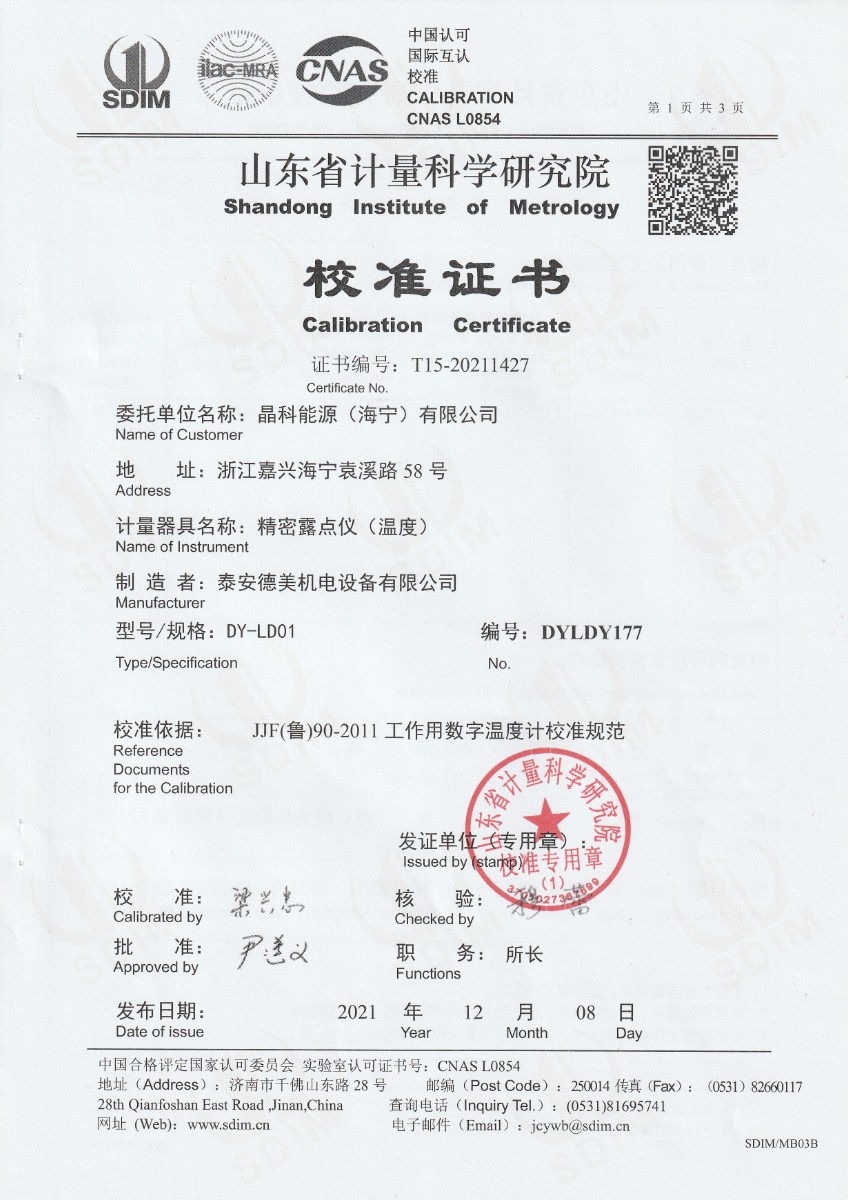 | 上一條:晶科能源(海寧)有限公司-精密露點(diǎn)儀(濕度) | 下一條:高精度制冷恒溫槽(-80~100℃)校準(zhǔn)證書 |