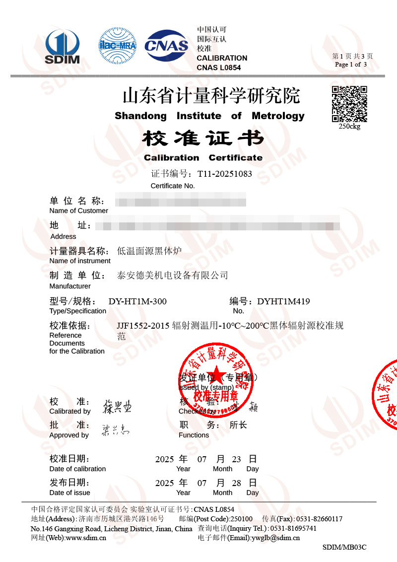 低溫面源黑體爐(0-60℃)校準(zhǔn)證書 2025-7-28 本文被閱讀 2751 次