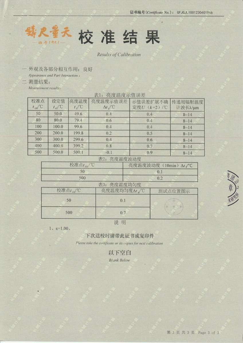 浙江弘志計量測試有限公司 黑體輻射源 校準證書 2023-5-4 本文被閱讀 13509 次