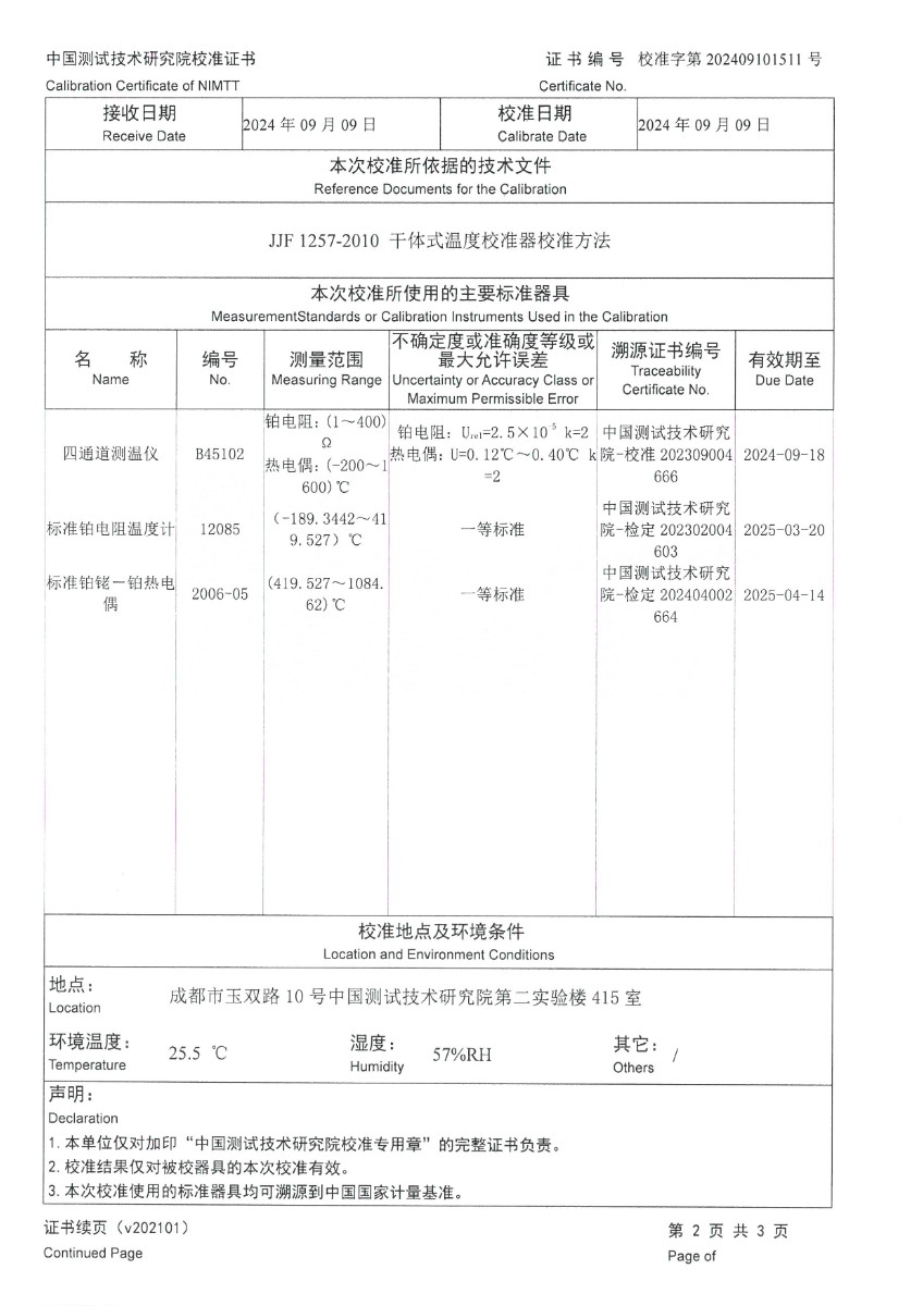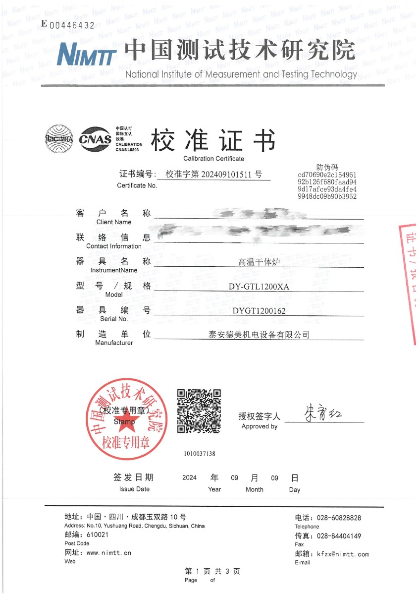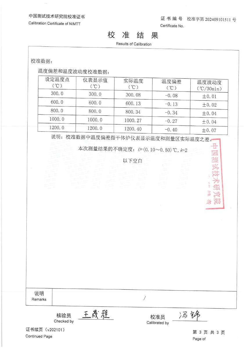 高溫干體爐(300~1200℃)校準證書 2024-9-11 本文被閱讀 6702 次