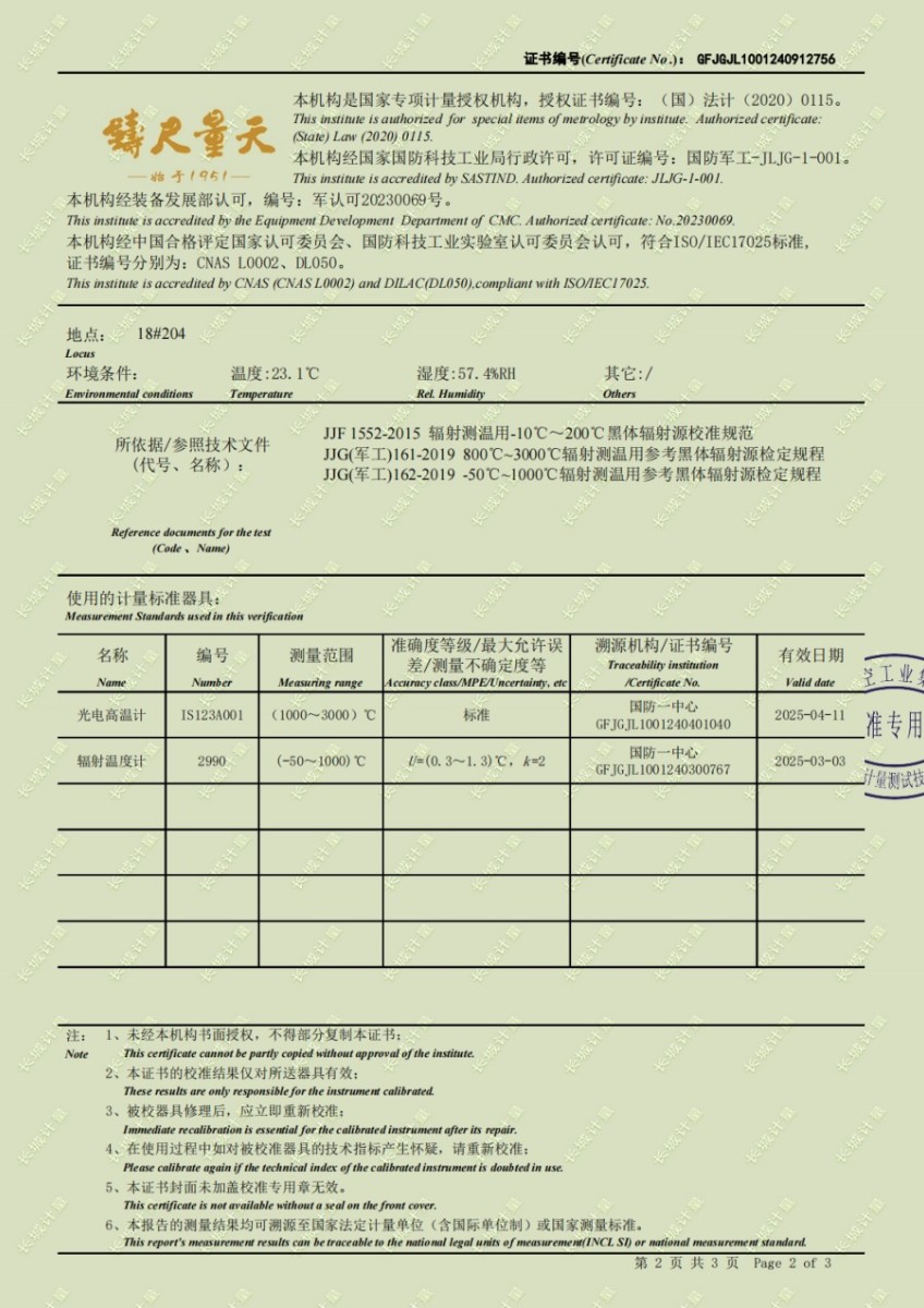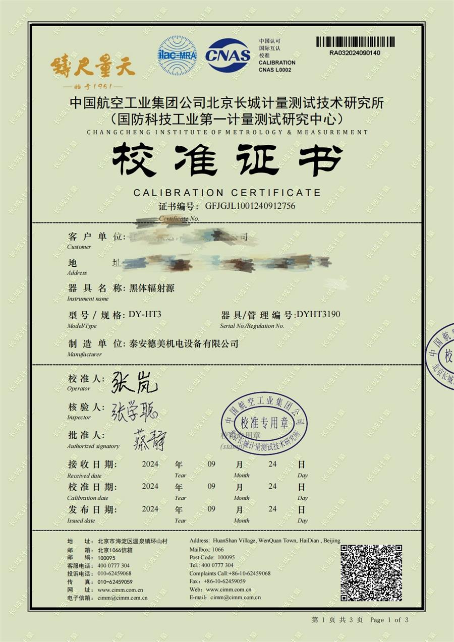 | 上一條:中溫黑體爐(50-500℃)校準(zhǔn)證書 | 下一條:高精度制冷恒溫槽(-80~100℃)校準(zhǔn)證書 |