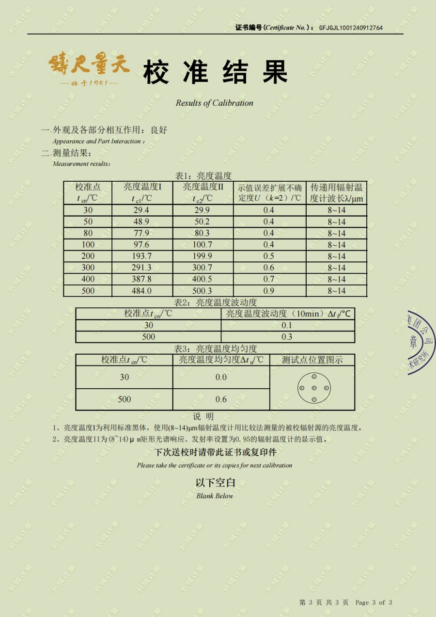 面源黑體爐(室溫+5-500℃)校準證書 2024-10-17 本文被閱讀 6420 次