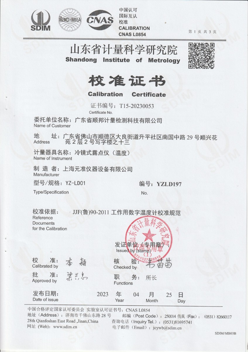 廣東省順邦計量檢測科技有限公司 冷鏡式露點儀(溫度) 校準證書 2023-5-4 本文被閱讀 9628 次