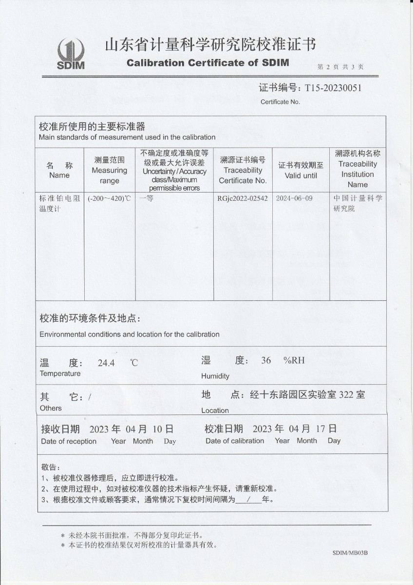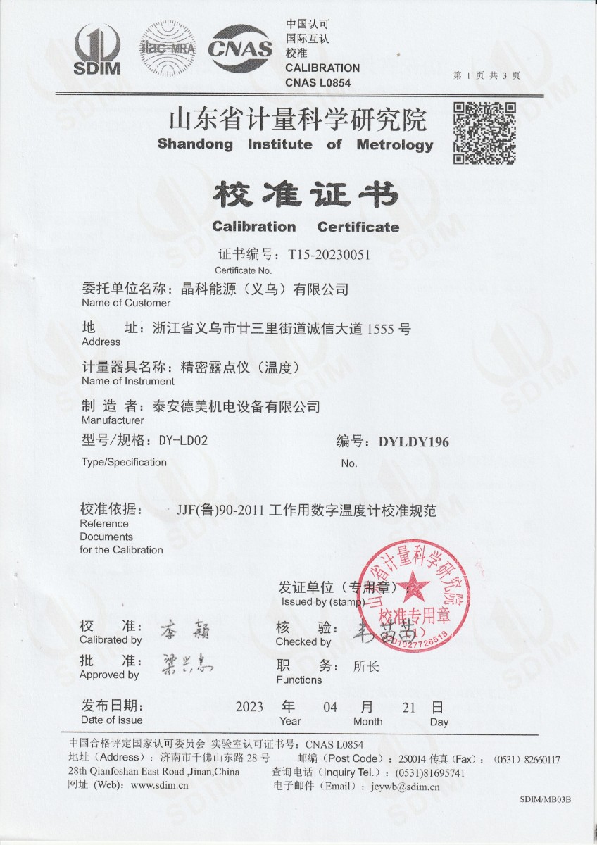 | 上一條:晶科能源(義烏)有限公司 精密露點儀 檢定證書 | 下一條:高精度制冷恒溫槽(-80~100℃)校準證書 |
